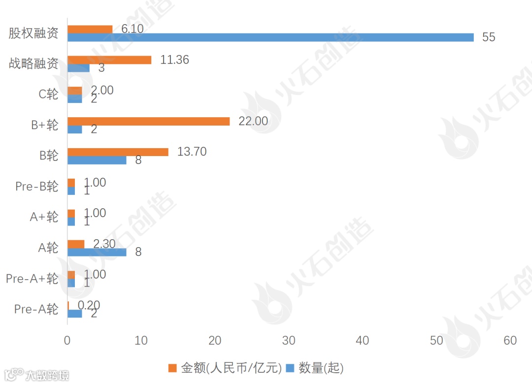 【融资轮次分布】从融资轮次上看,本月融资事件大多集中在股权融资,有55个项目获投。从融资金额来看,B+轮获得最高融资金额22.00亿元,占总体融资金额的36.27%;其次,B轮也获得了较高的融资金额13.70亿元,占总体融资金额的22.58%。