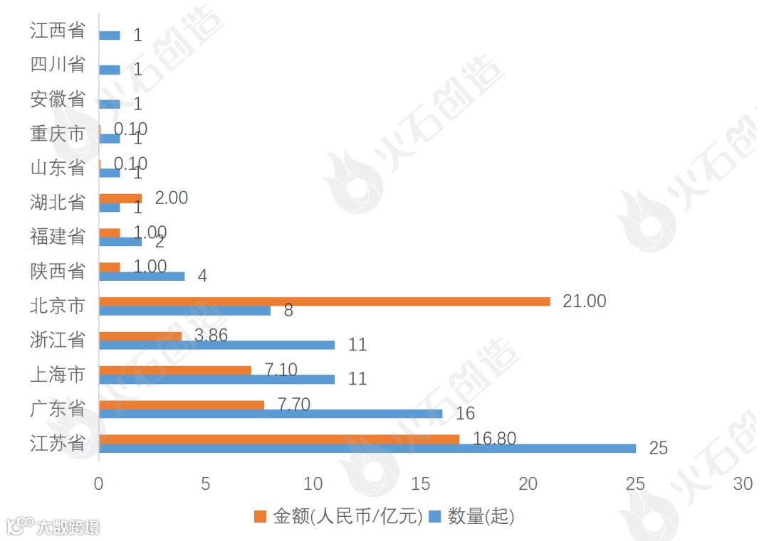 【融资地域分布】本月融资项目主要分布在江苏省和广东省,分别有25个和16个项目获投。从融资金额来看,北京市最为突出,融资金额高达21.00亿元,占总融资金额的34.62%;其次,江苏省也较为突出,融资金额达16.80亿元,占总融资金额的27.70%。