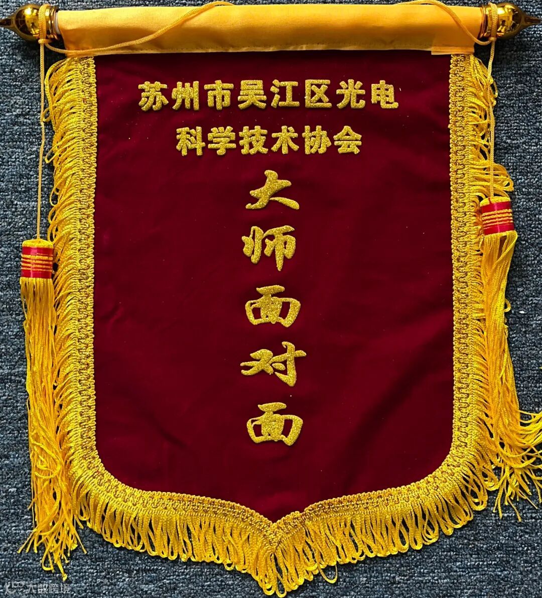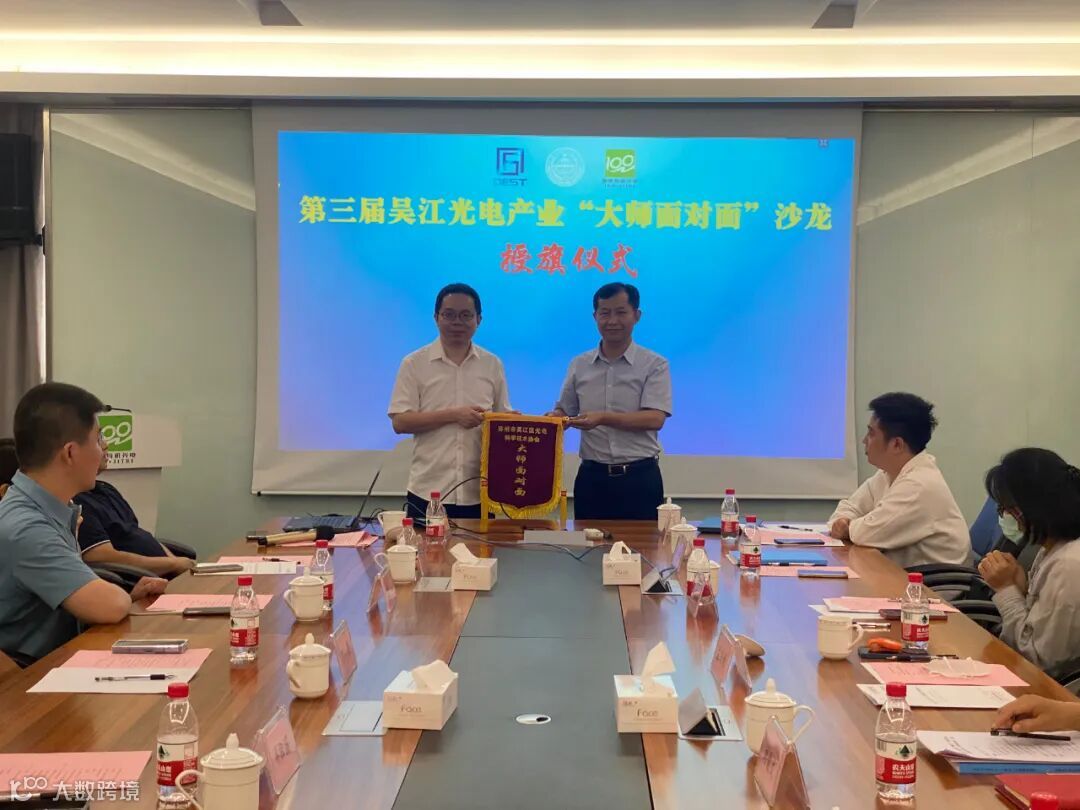 “大师面对面”是吴江光电产业科协自2020年创立的一个特色活动品牌,已先后与韦冬国家级技能大师工作室、孙勤良国家级技能大师工作室联合成功举办了两届。本次活动上,举行了第三届吴江光电产业“大师面对面”沙龙。吴江区科协孟庆利主席向苏州魅力科技团队—廖良生团队授旗,樊健副所长现场接旗。活动上,樊所长还作了题为《钙钛矿太阳能电池简介》的“大师面对面”专题交流。
