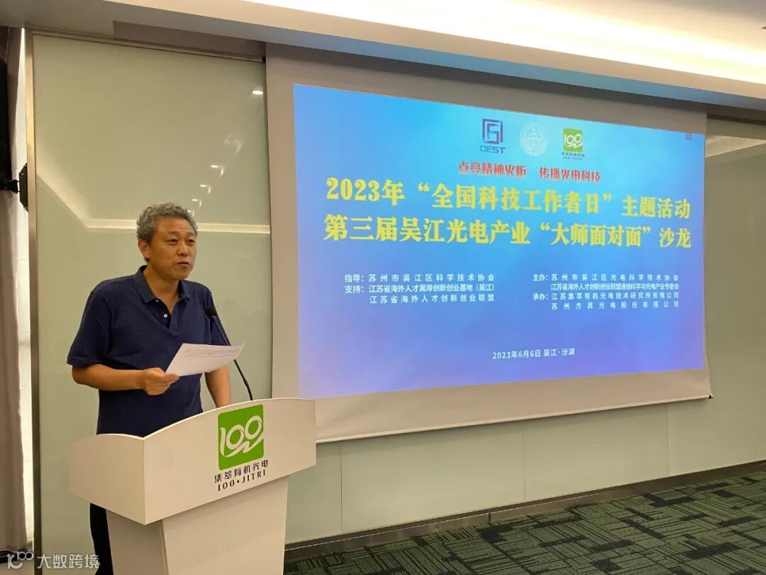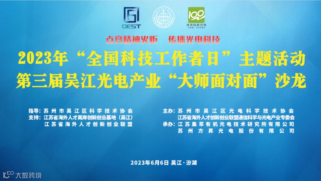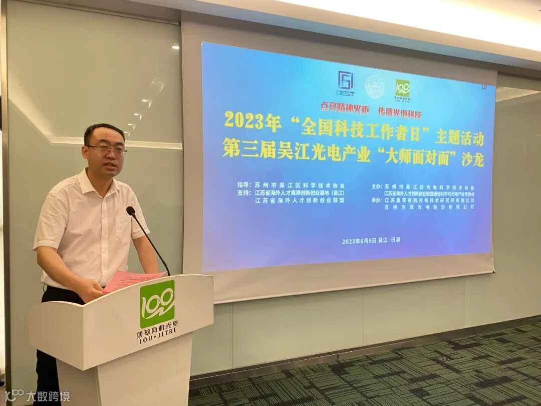 6月6日,2023年“全国科技工作者日”主题活动暨第三届吴江光电产业“大师面对面”沙龙活动在江苏集萃有机光电技术研究所有限公司顺利举办。由吴江区科学技术协会的指导,江苏省海外人才离岸创新创业基地(吴江)、江苏省海外人才创新创业联盟支持,苏州市吴江区光电科学技术协会、江苏省海外人才创新创业联盟通信科学与光电产业专委会主办,江苏集萃有机光电技术研究所有限公司、苏州方昇光电股份有限公司承办。