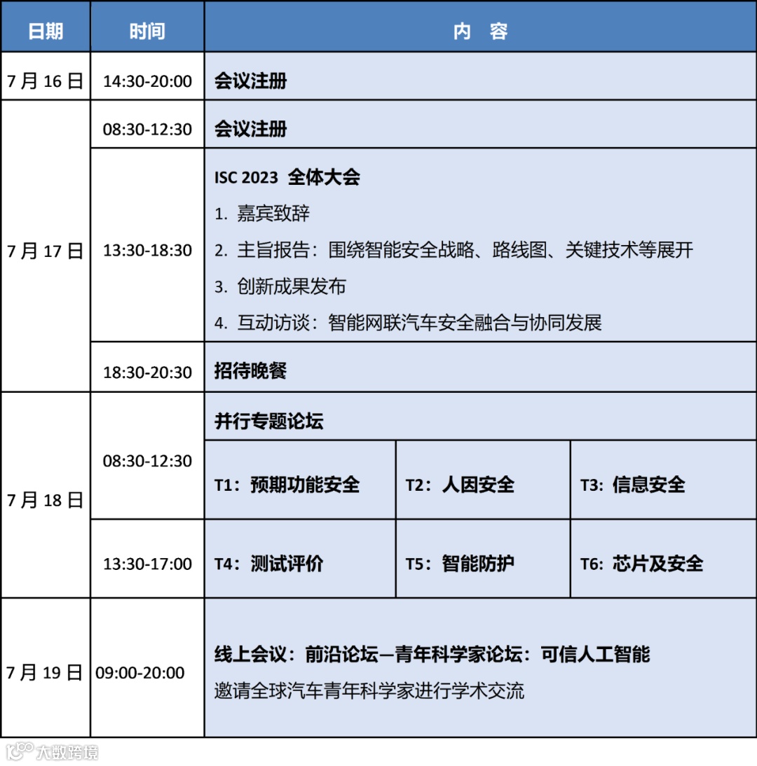 第五届世界智能安全大会(FISITA Intelligent Safety Conference China, ISCC 2023)将于2023年7月17-19日在重庆举办。ISCC是由世界汽车工程师学会联合会(FISITA)与中国汽车工程学会联合打造的国际交流平台,聚焦自动驾驶安全。会议将围绕预期功能安全、信息安全、人因工程、安全测试评价、智能防护、人工智能等主题展开,邀请全球相关领域的专家学者和广大科技工作者参与。