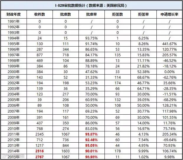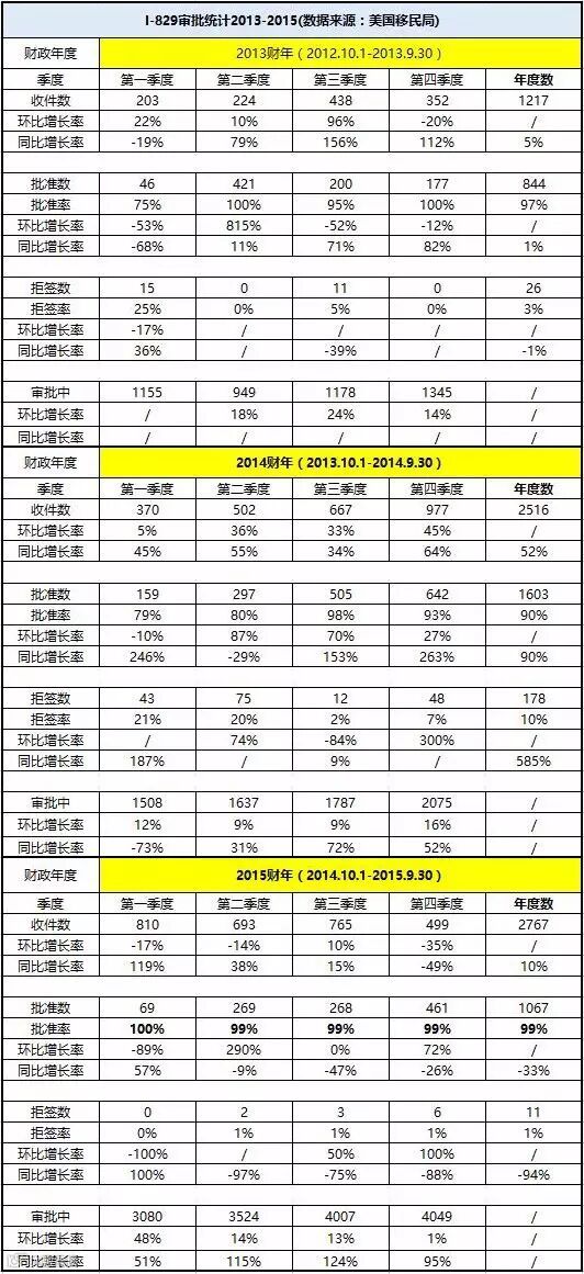 I-829审批统计2013-2015(数据来源:美国移民局)