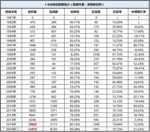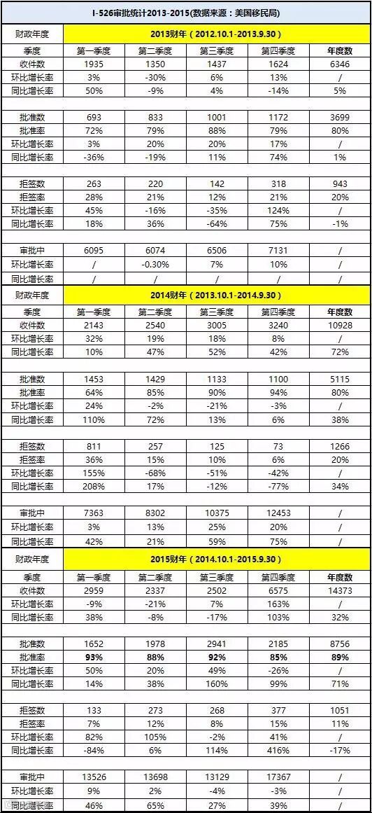 I-526审批统计2013-2015(数据来源:美国移民局)