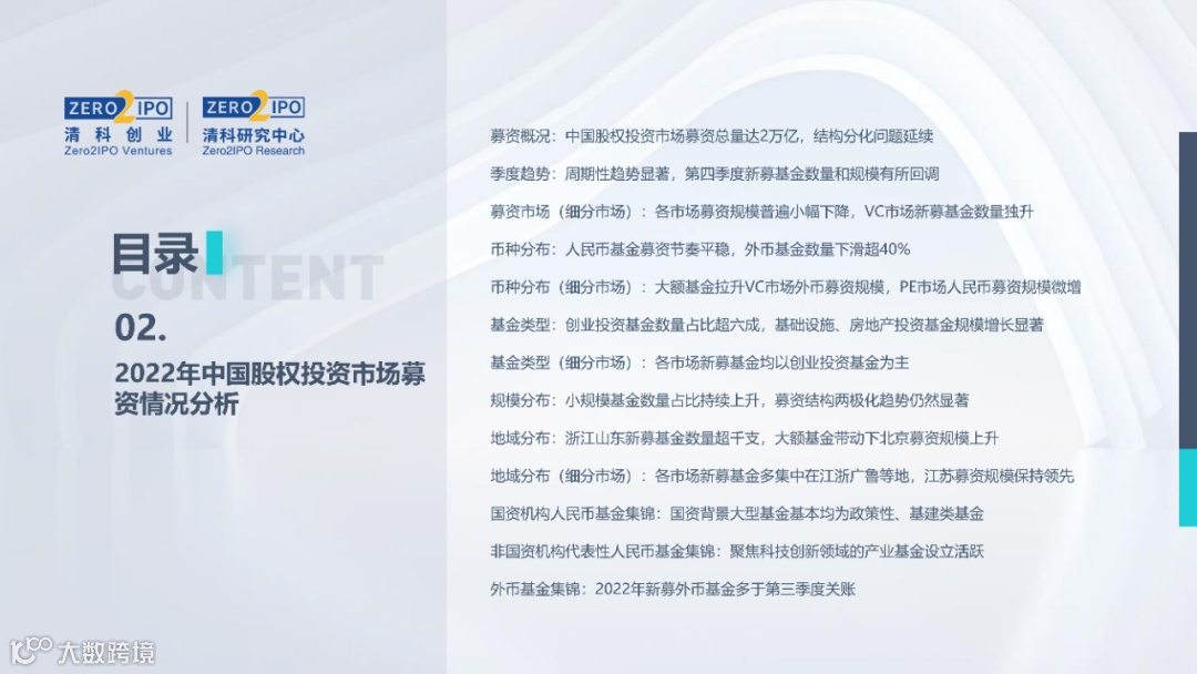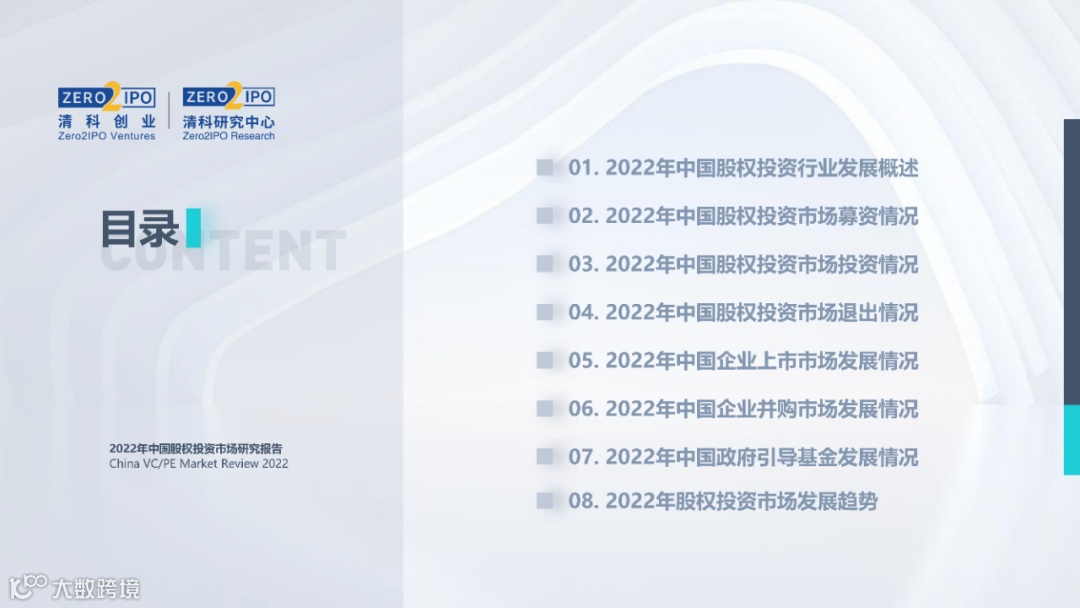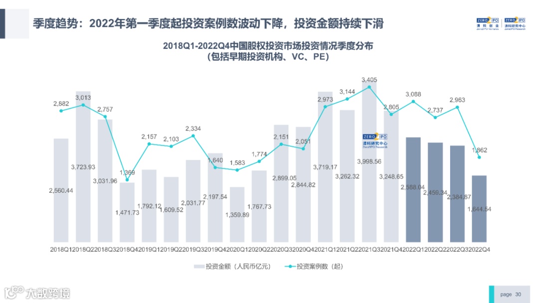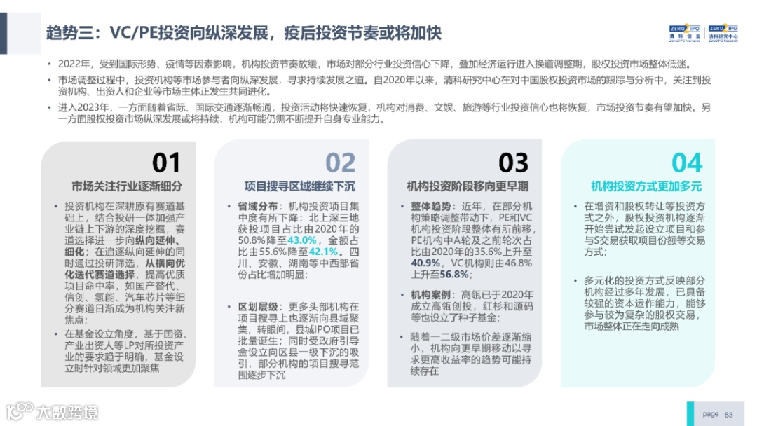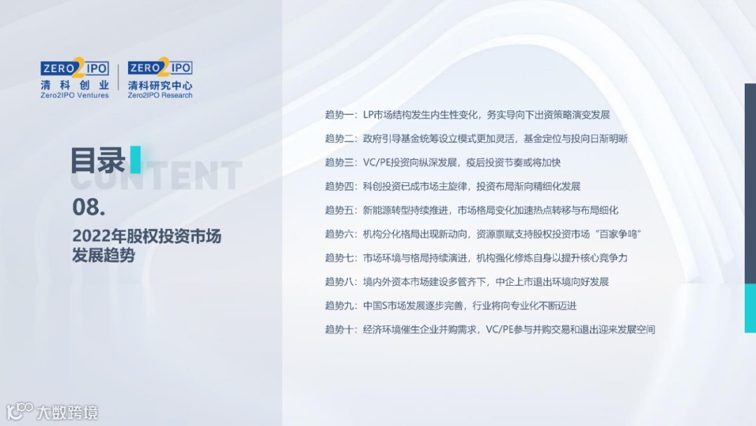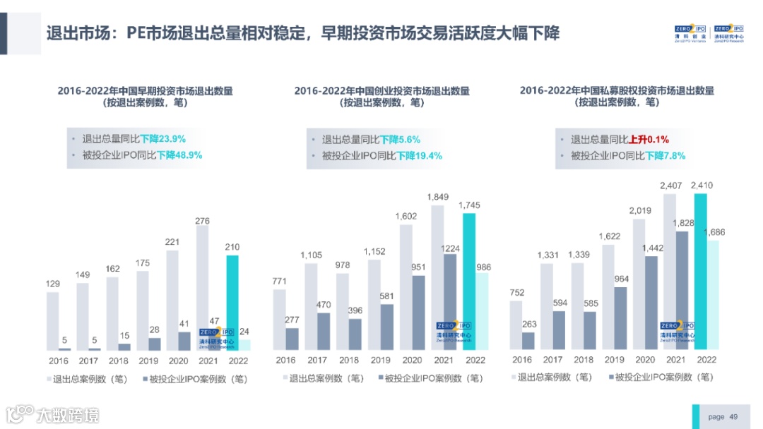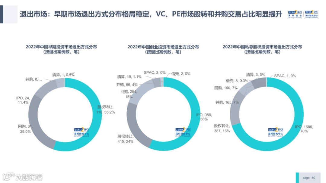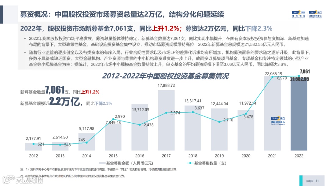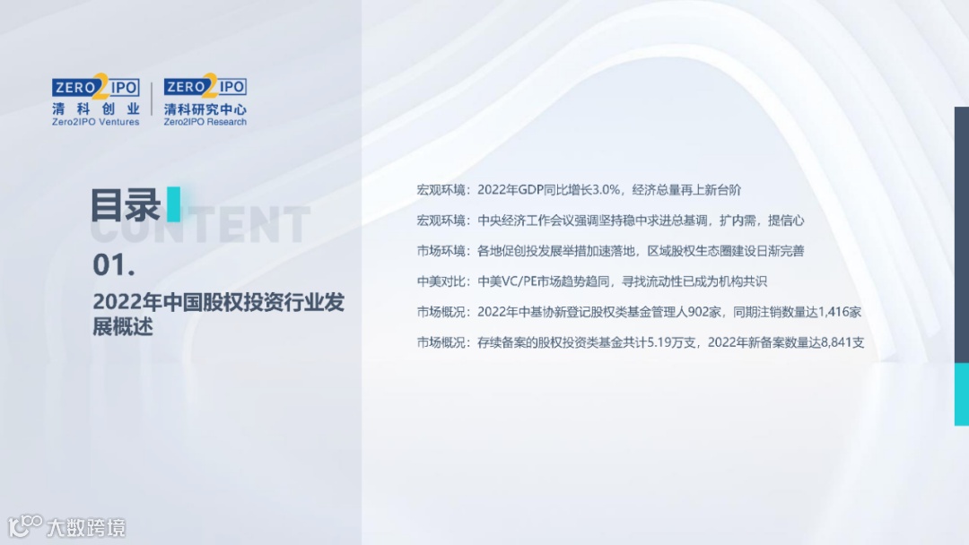 2022年中国股权投资市场外部承压、内部求变,各市场在优化调整中延续高质量发展态势。其中,募资总量维持稳定,新募基金数量达7,061支,同比小幅提升;在国有资本股权投资参与度加深、新基建加速布局的背景下,大型政策性基金、基础设施投资基金集中设立,推动市场募资规模维持高位。投资节奏趋缓,2022年共发生10,650起投资案例,涉及金额9,076.79亿元,同比分别下滑13.6%、36.2%;硬科技投资成为市场主导,半导体、新能源和汽车等行业投资总量逆势上涨。退出案例数为4,365笔,同比小幅下降3.7%,被投企业IPO数量及占比同步减少,并购、股转和回购的交易热度明显提升;随着IPO项目溢价逐步降低和上市不确定性持续增加,VC/PE机构也开始调整退出策略,积极采用更加灵活、多样的退出方式以获取现金收益。而随着股权投资市场的不断调整,市场环境的优化、投资机构的进化、投资策略的细化等也将成为未来市场的主要发展趋势。更多股权投资市场前瞻解读,点击阅读原文,下载《2022年中国股权投资市场研究报告(完整版)》。