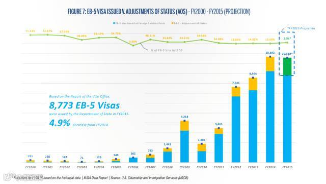 * 2014年,13.69%的绿卡是通过在美国调整身份(I-485)的方式获得,预计在2015年,将达到21%。