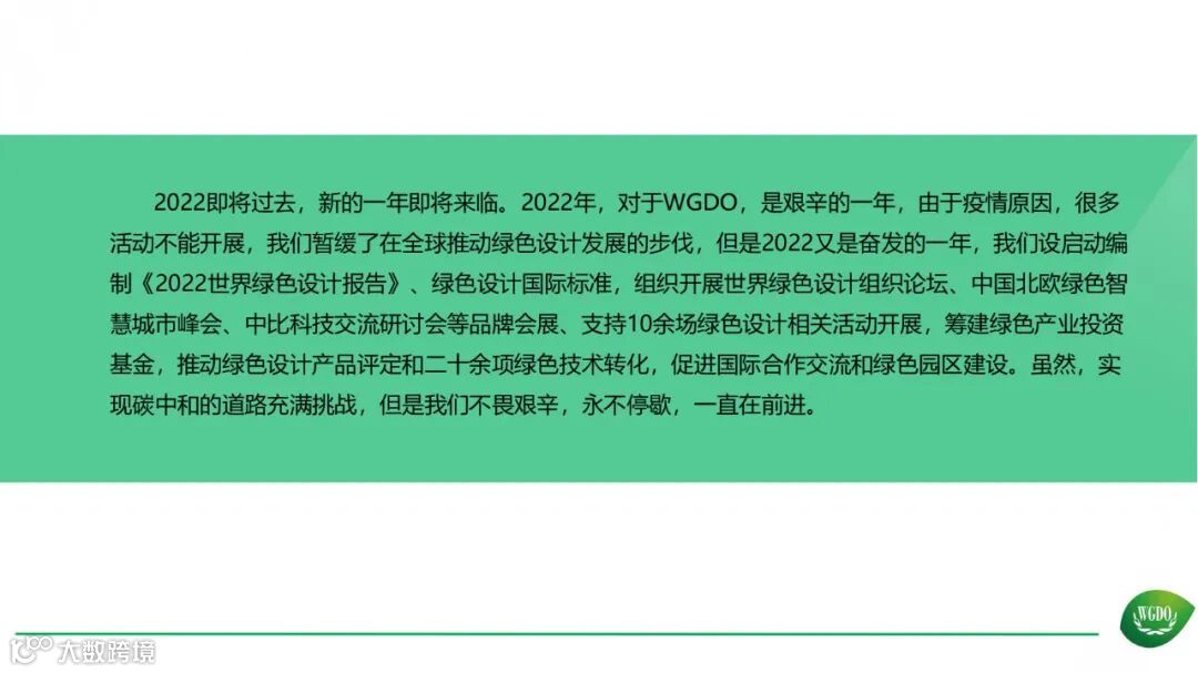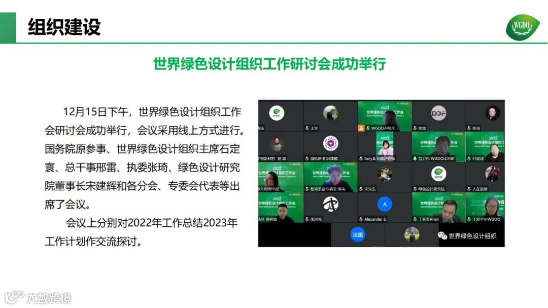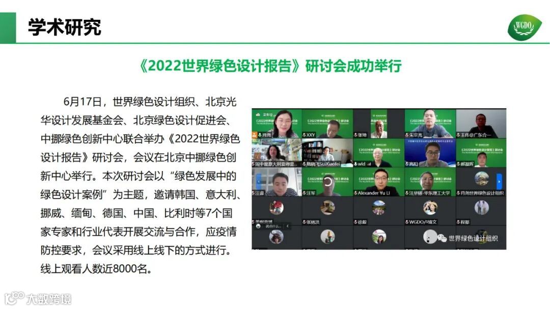 经过几年时间的发展,世界绿色设计组织(比利时)北京代表处在组织建设、专委会建设、学术研究、标准制定、会展活动、园区建设、合作交流等方面取得了一系列成果,详见2022年工作年报。