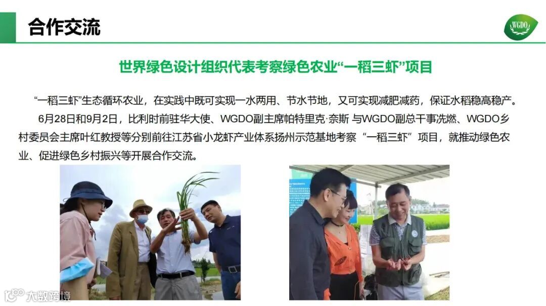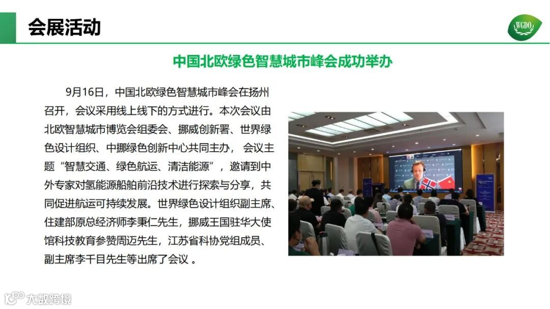 WGDO已在全球7个国家(比、英、法、意、德、韩、缅)设立了分会、在中国设立了北京代表处,设立包括绿色建筑专委会、绿色能源专委会、生物质新材料专委会、绿色智能制造专委会、绿色金融专委会等21个专委会。先后在比利时布鲁塞尔、德国弗莱堡、意大利米兰、坦桑尼亚达累斯萨拉姆、韩国首尔、中国扬州连续举办世界绿色设计论坛。形成包括世界绿色设计博览会、绿色设计国际贡献奖、绿色设计国际大奖、《世界绿色设计报告》、中挪绿色创新中心等多个品牌项目。