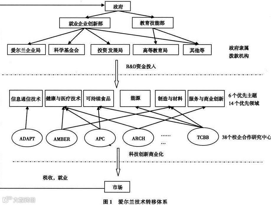 大学技术转移的核心是知识的对接与交换,所以各方信息的透明与高效传递直接关系到技术转移的效率。为了整合不同创新主体及大学 TTO 的资源并及时准确地传递政府的最新政策,形成统一规范的技术转移标准,爱尔兰政府于2013 年成立了国家中心技术转移 办 公 室 (Central Technology Transfer Office,cTTO),它设立在爱尔兰企业局。爱尔兰的技术转移体系是由政府引导,政府各职能部门负责相关科技创新事务,如就业企业创新部(Department of Jobs,Enterprise and Innovation)主要负责宏观创新政策的制定,教育技能部(Department of Education and Skills)则主要管理大学开展的基础性研究,它们通过其隶属机构,诸如爱尔兰企业局(Enterprise Ireland,EI)、投资发展局(Investment Development Agency,IDA)、科学基金会(Science Foundation Ireland,SFI)、高等教育局(Higher Education Authority,HEA)等,对大学技术转移提供相应的资金支持和政策指导。这些隶属机构通过选取关键性学科领域,将国家 R&D 资金分拨给各分支研究机构、大学及其科研人员,开展研发创新并将成果推向市场。为了更高效地使资金投入转化为创新生产力及经济增长,促进大学技术转移, 爱尔兰政府还成立了相关研究小组,选定了 14 个最具有技术转移潜力的优先研究领域,并将其划归成 6 个重要的研究主题,分别在爱尔兰的不同区域成立了38 个技术研究中心。从 2014 年开始 CTTO 正式更名为爱尔兰知识转移中心(Knowledge Transfer Ire-land,KTI)。KTI 将政府、大学、研究机构、企业等多方信息汇集,并建立在线平台。