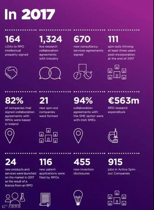1、据年报统计,2017 年爱尔兰产研合作 1324 项,开发产品和服务 24 项,为衍生公司创造 915 个就业岗位,新成立 21 个新衍生公司,签署164 项许可协议,其中,82的合作协议是与爱尔兰企业合作。