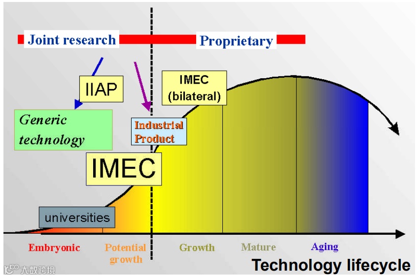 产业联合项目计划(IIAP)是IMEC 1991年创立的与产业界开展联合研究的合作模式,在共享研发费用、科研人员、知识产权以及共担风险的基础上,联合几家或几十家全球有实力的企业,开展领先市场需求3~8年的项目研究,攻克某项技术在产业应用之前的技术瓶颈。值得注意的是,联合计划的具体项目并不是由大企业主导从自己的需求方向提出的,而是IMEC站在专业角度,对行业关键共性技术突破的迫切需要进行判断后选定的。项目确定后,有意向的企业通过自身评估和外部环境考察,决定是否参与。