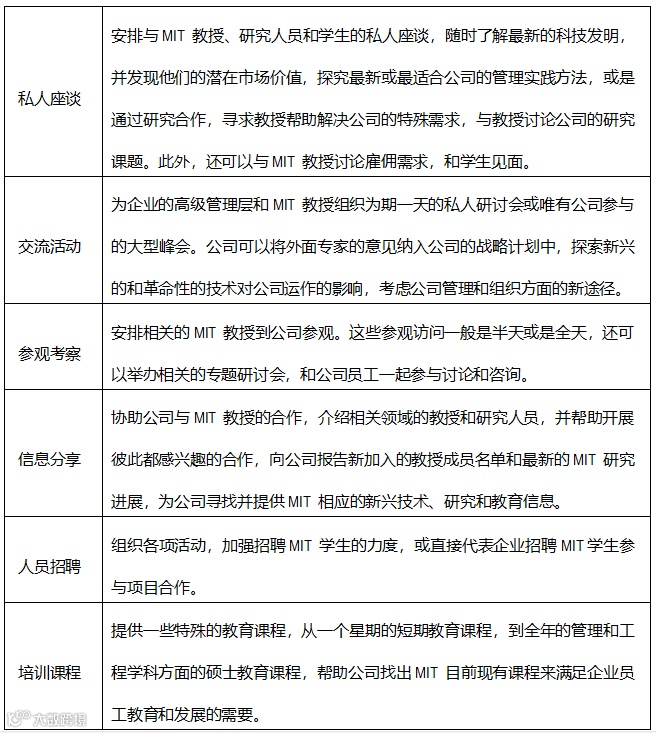 表2. 麻省理工学院全球产业联盟(MIT Industrial Liaison Program,MIT-ILP)服务内容