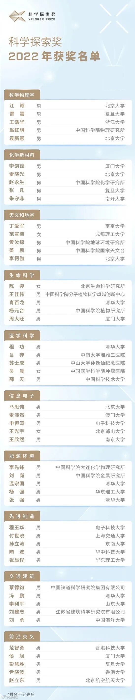 作为一项由科学家主导的公益奖项,“科学探索奖”秉承“面向未来、奖励潜力、鼓励探索”的宗旨,鼓励青年科技工作者心无旁骛地探索科学“无人区”。“科学探索奖”秘书处介绍,在今年奖项的提名、推荐、评审过程中,有超过900位各国院士,30多所著名高校校长参与。仅在提名推荐阶段,就有20多位诺贝尔奖、图灵奖、菲尔兹奖等国际大奖得主参与其中。