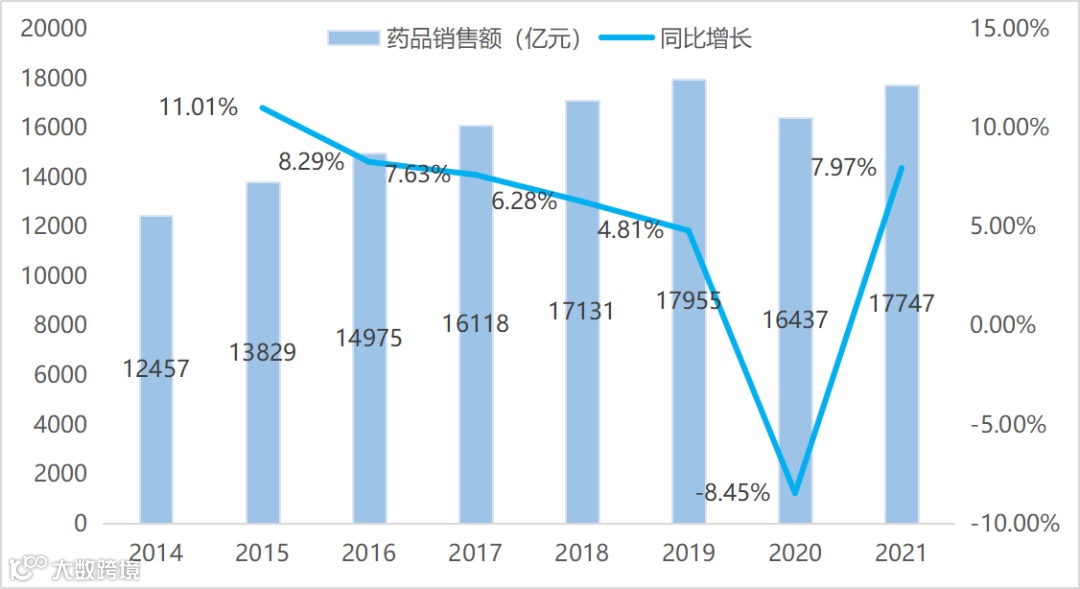 图1:2014-2021年中国三大终端药品销售总额统计