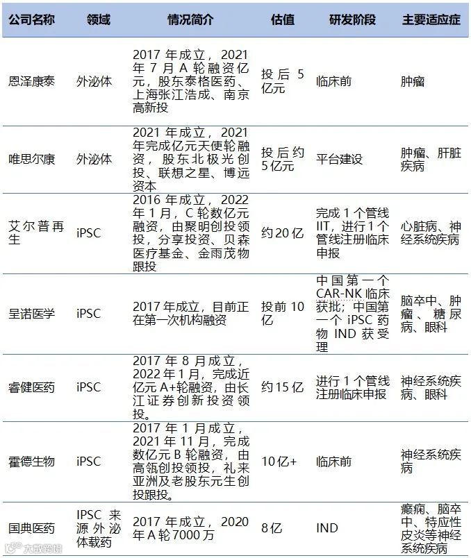 行业中外泌体及iPSC创新药企业临床前研发阶段估值在5-10亿元,注册临床申报阶段企业估值进一步增长到10-20亿元。除临床进展外,不同技术路线也会对项目估值造成较大影响。