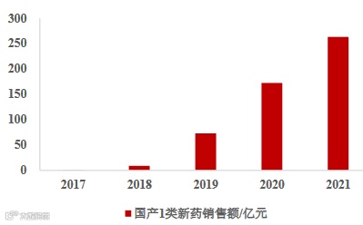 从国内医改后获批的国产一类新药来看,2021年销售额已经达到263.2亿元,同比增长52.5%,更是2017年该类新药销售额的1133倍。