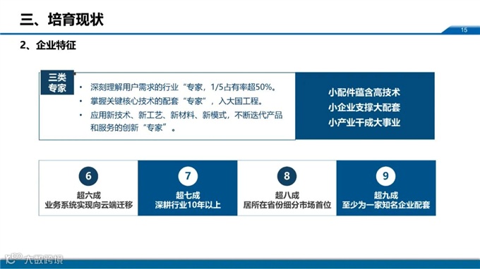 周主任提到,“专精特新”企业特征为“6789”即超六成业务系统实现向云端迁移、超七成深耕行业10年以上、超八成居所在省份细分市场首位、超九成至少为一家知名企业配套。