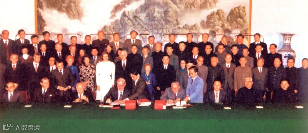 1985年1月18日,广东核电合营有限公司合营合同签字仪式在人民大会堂举行(前排左三为时任中电主席罗兰士嘉道理勋爵)。