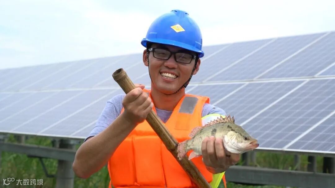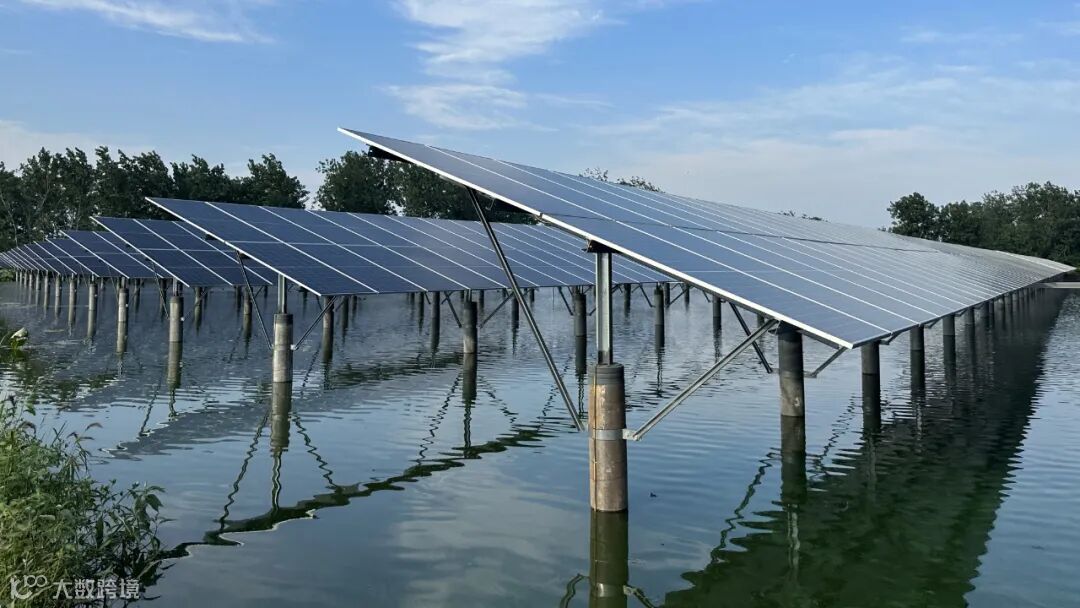中电在江苏省泗洪太阳能光伏电站采用“渔光互补”模式,在太阳能光伏板下发展养鱼场
