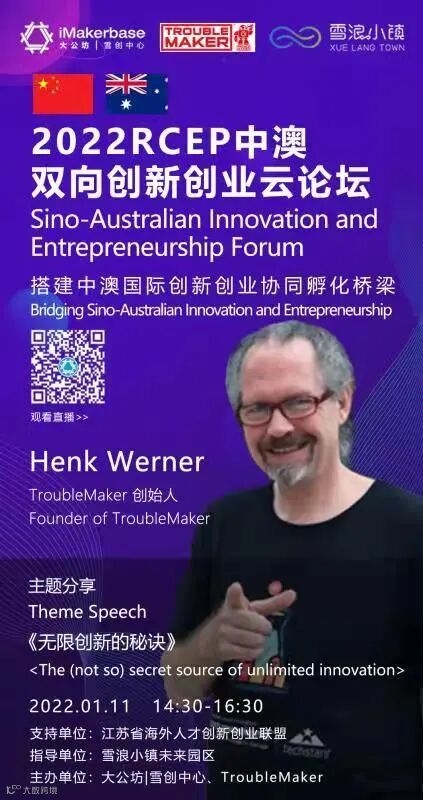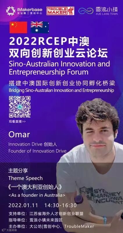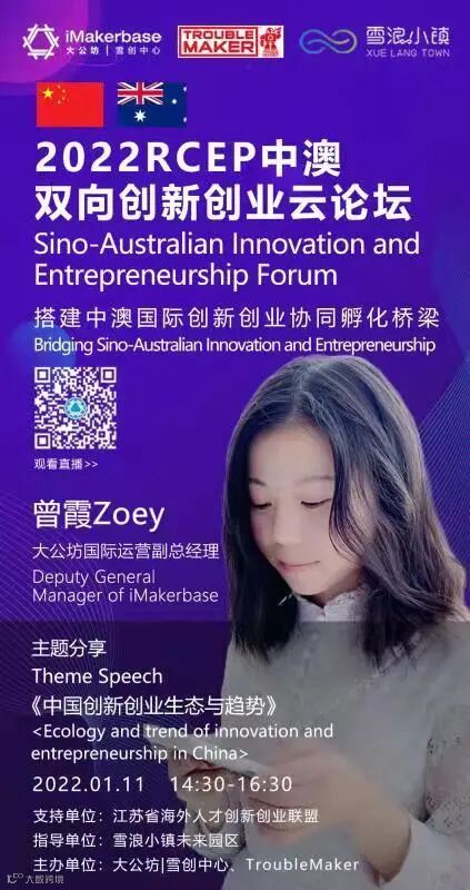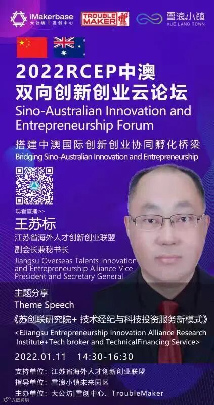 由江苏省海外人才创新创业联盟支持,雪浪小镇未来园区指导,大公坊|雪浪中心主办的2022RCEP中澳双向创业云论坛,将于1月11日 下午14:30-16:30举办。