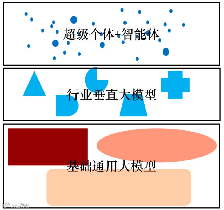 底层由大模型支撑标准化服务; 中层是垂直行业模型驱动的专业协作网络; 顶端则由超级个体及其AI伙伴构成创新生态。