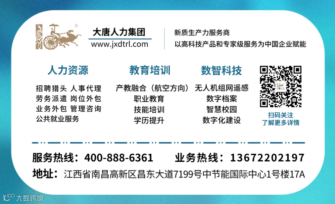 主营业务:一、人力资源:招聘猎头、人事代理、劳务派遣、岗位/业务外包、管理咨询、公共就业服务;二、教育培训:产教融合(航空)、职业教育、技能培训、学历提升;三、数智科技:无人机组网遥感、AI服务机器人、数字档案、智慧校园、单位数字化建设。