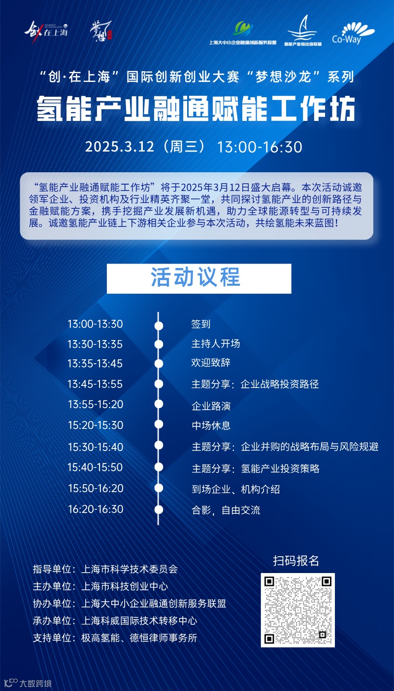 在上海市科学技术委员会指导下,由上海市科技创业中心主办、上海科威国际技术转移中心承办的“创·在上海”国际创新创业大赛“梦想沙龙”系列之“氢能产业融通赋能工作坊”将于3月12日盛大启幕。活动不仅将邀请领军企业、投资机构及行业精英齐聚一堂,共同探讨氢能产业创新路径与金融赋能方案,还将为科创企业提供自我展示机会,旨在为产业链各方搭建高效的交流与合作平台,携手挖掘产业发展新机遇,助力全球能源转型与可持续发展。诚邀氢能产业链上下游企业莅临,共绘氢能未来蓝图!名额有限,报名从速,谢绝空降!