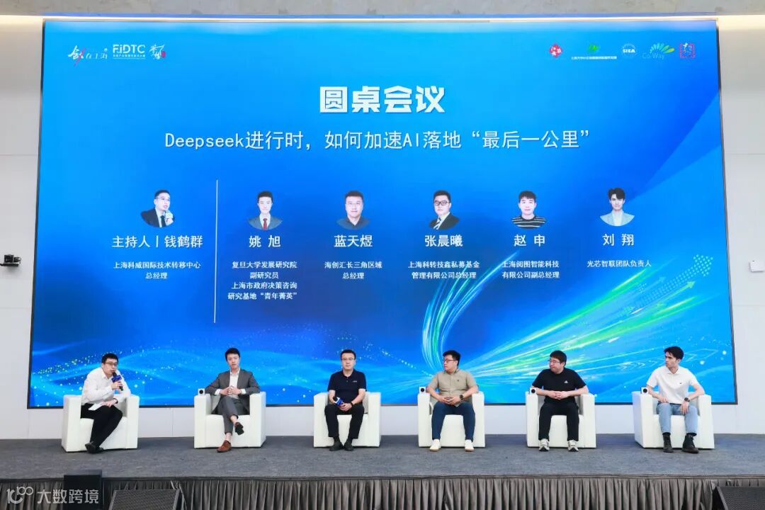 圆桌讨论环节,在上海科威国际技术转移中心总经理钱鹤群的主持下,复旦大学发展研究院副研究员姚旭、海创汇长三角区域总经理蓝天煜、上海科转技鑫私募基金管理有限公司总经理张晨曦、上海阅图智能科技有限公司副总经理赵申和光芯智联团队负责人刘翔,分别作为高校研究机构、产业机构、投资机构、AI应用企业和新生代技术创新力量的代表,从各自不同的多元视角,围绕“DeepSeek时代,如何加速AI落地最后一公里”展开了一场跨界融合的深度对话。