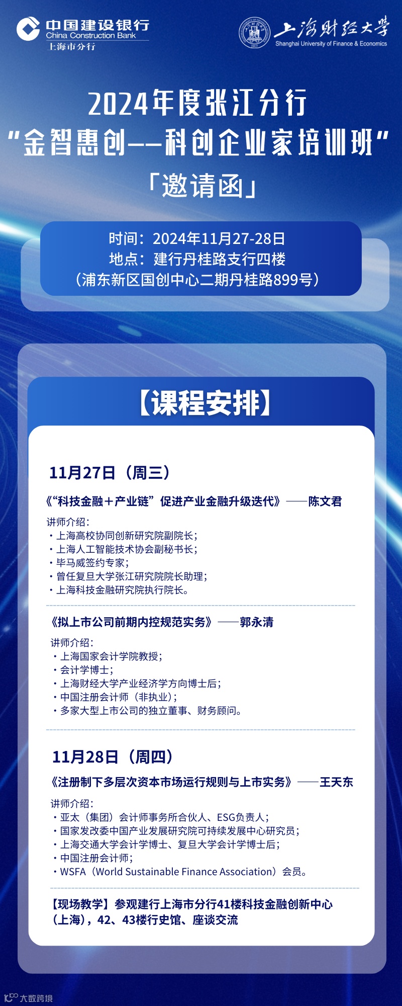 11月27-28日,建设银行张江分行倾力打造的2024年度“金智惠创——科创企业家培训班”即将在建行丹桂路支行拉开帷幕!行业权威导师倾囊相授,带来干货满满的科技金融实务解析,助力科创企业家创业成长之路稳健前行。诚邀科创企业家踊跃报名,名额有限,欲报从速!