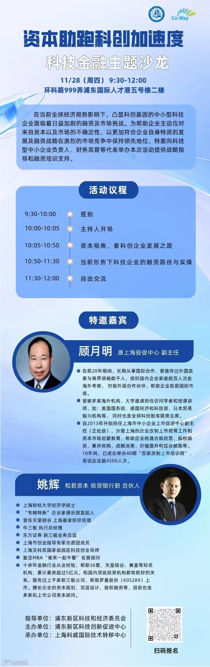 本次活动特邀行业资深导师,立足资本视角,为科创企业的发展之路指点迷津,面对面分享当前形势下科技企业的融资路径与实操经验,助力企业精准定位,制定贴合自身特色的发展与融资策略,以在激烈的市场竞争中稳固领先地位,实现加速成长。欢迎企业扫码报名,名额有限,报名从速!