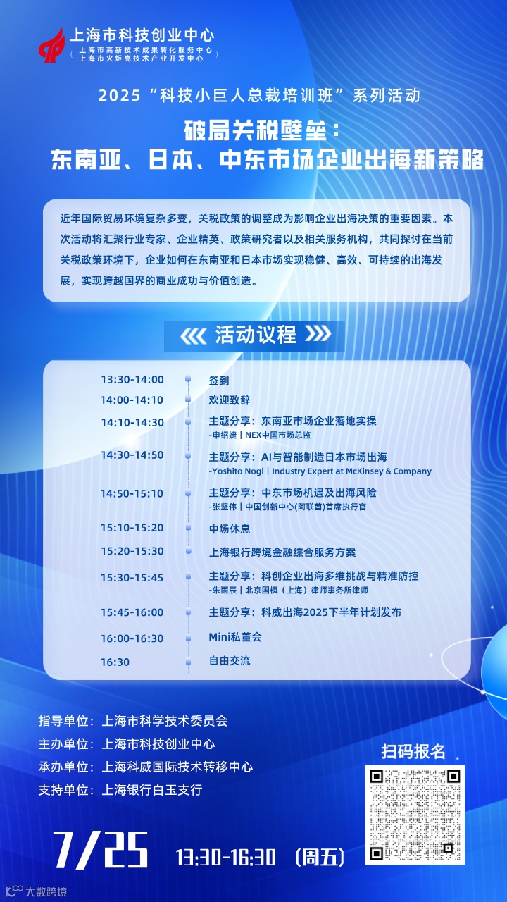 为助力企业突破关税壁垒,更好把握市场机遇,7月25日下午,由上海市科技创业中心主办、上海科威国际技术转移中心承办的 2025“科技小巨人总裁培训班”系列活动——破局关税壁垒:东南亚、日本、中东市场企业出海新策略将隆重开启。本次活动旨在汇聚行业专家、企业精英、政策研究者以及相关服务机构,共同探讨在当前关税政策环境下,企业如何在东南亚、日本及中东市场实现稳健、高效、可持续的出海发展。