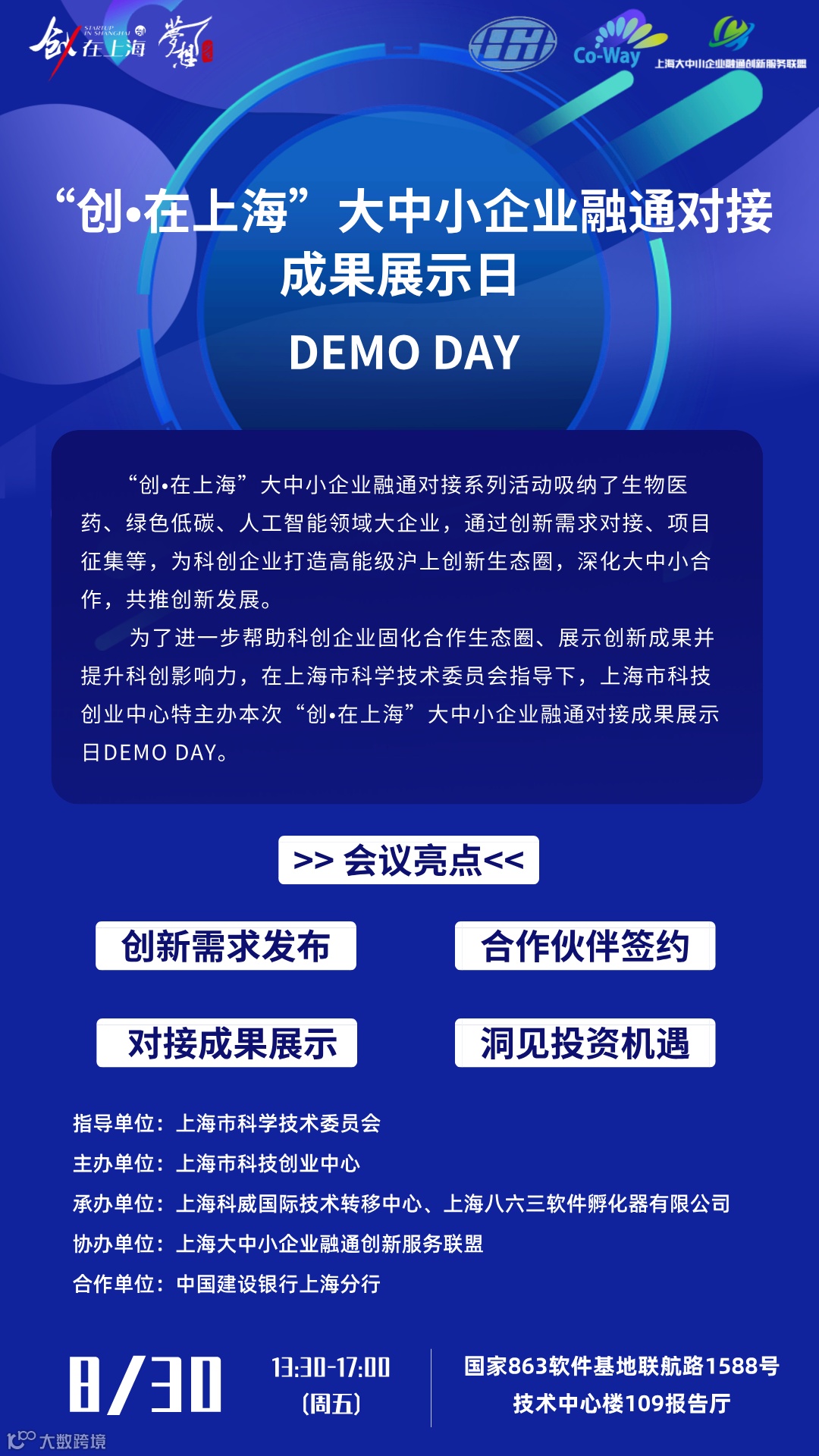 为了进一步帮助科创企业固化合作生态圈、展示创新成果并提升科创影响力,在上海市科学技术委员会指导下,由上海市科技创业中心主办的“创·在上海”大中小企业融通对接成果展示日DEMO DAY将于8月30日下午隆重开启。本次活动由上海科威国际技术转移中心和上海八六三软件孵化器有限公司共同承办。