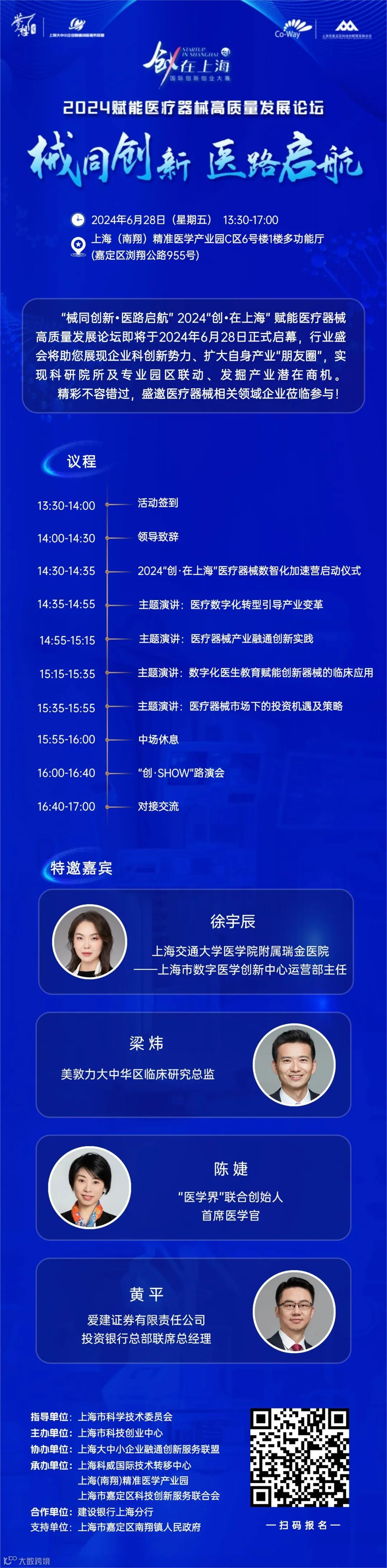 为进一步打造协同高效的医疗产业融通创新生态,赋能更多科创企业高质量发展,在上海市科学技术委员会的指导下,由上海市科技创业中心主办的“械同创新•医路启航” 2024“创•在上海” 赋能医疗器械高质量发展论坛将于6月28日下午隆重拉开帷幕。本次活动由上海科威国际技术转移中心、上海市嘉定区科技创新服务联合会和上海(南翔)精准医学产业园共同承办。