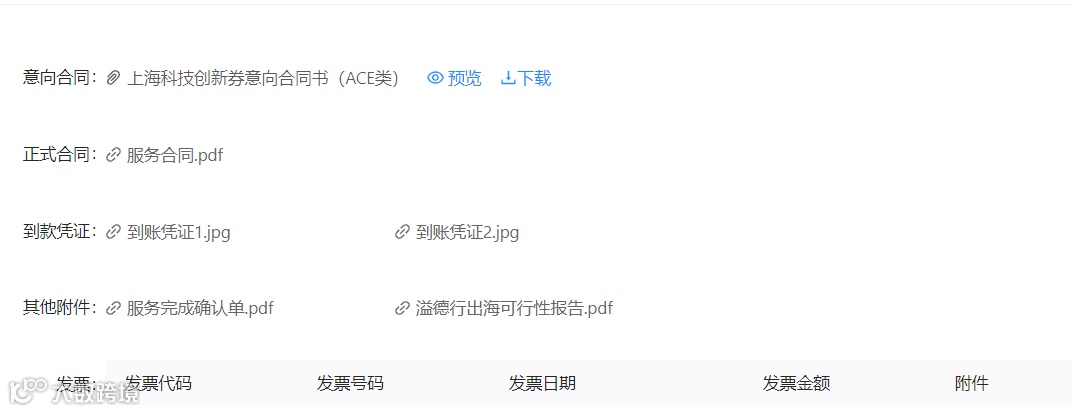 科威完成服务后 “申请兑付”,上传意向合同、正式合同、到款凭证,发票信息、服务完成确认单以及交付材料,“确认提交”后,需要买家在平台上进行确认。完成以上步骤后,进入审核阶段(1-2个月)。