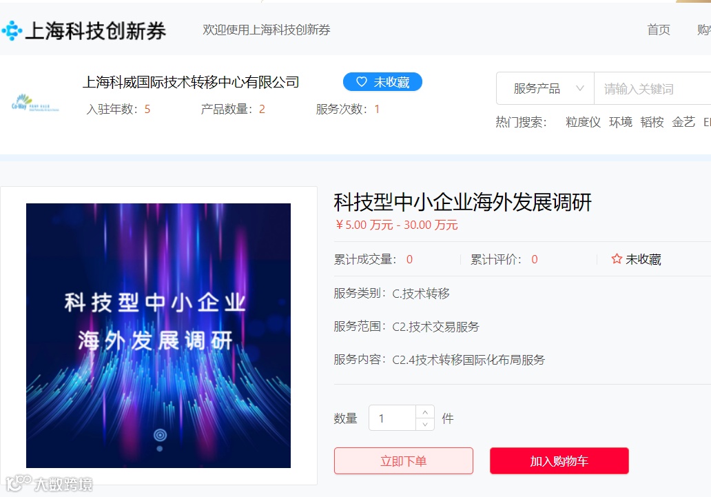 以“科技型中小企业海外发展调研”为例,企业点击“立即下单”即可开始下单。