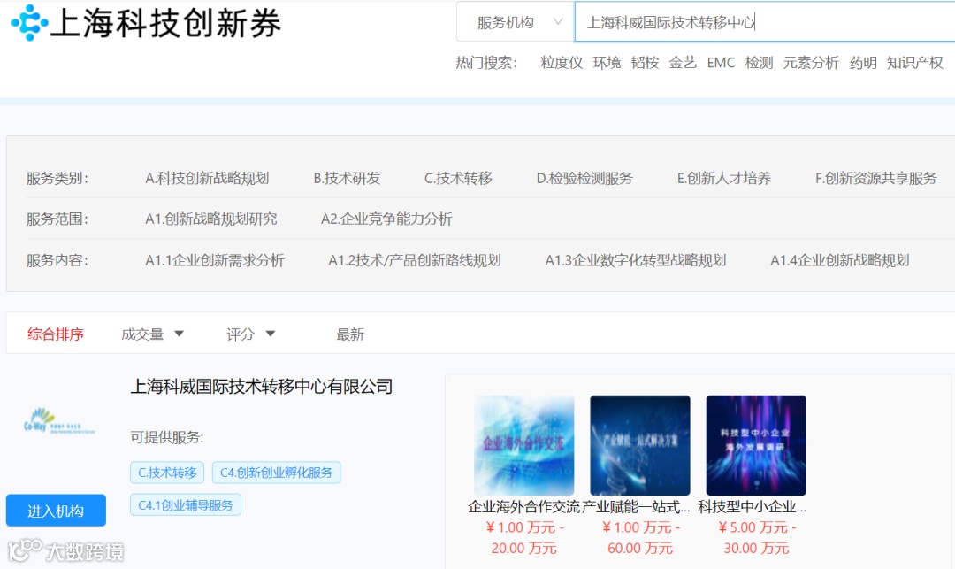 上海科威在上海科技创新券平台上推出了促进项目成果优化推广的产业赋能服务包,企业可以在上海科技创新券平台http://cxq.stcsm.sh.gov.cn/下单,在左上角“服务机构”下拉式搜索栏中输入“上海科威国际技术转移中心”点击搜索,可找到上海科威的“产业赋能一站式解决方案”服务包,企业可根据需求下单。