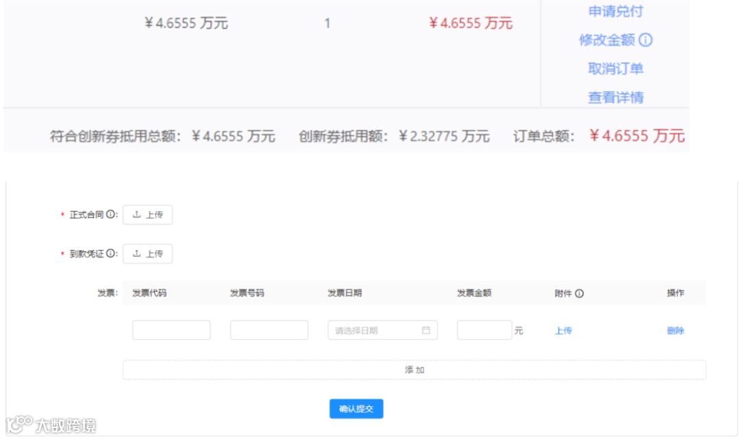 额度放出后,选择“申请兑付”,提供正式合同、到款凭证,以及发票信息,“确认提交”后,需要买家在平台上进行确认。完成以上步骤后,进入审核阶段。(1-2个月)