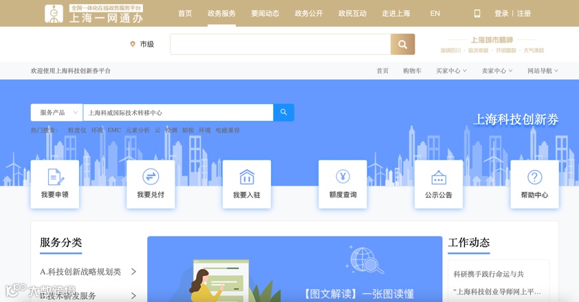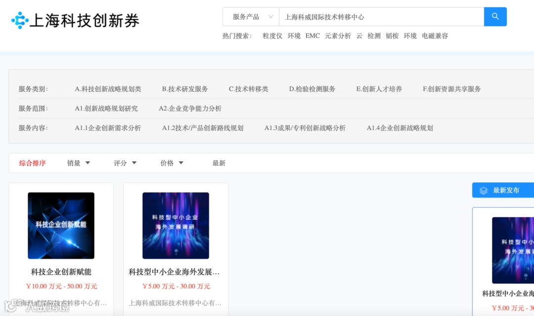 在“服务产品”搜索栏输入“上海科威国际技术转移中心”点击搜索;