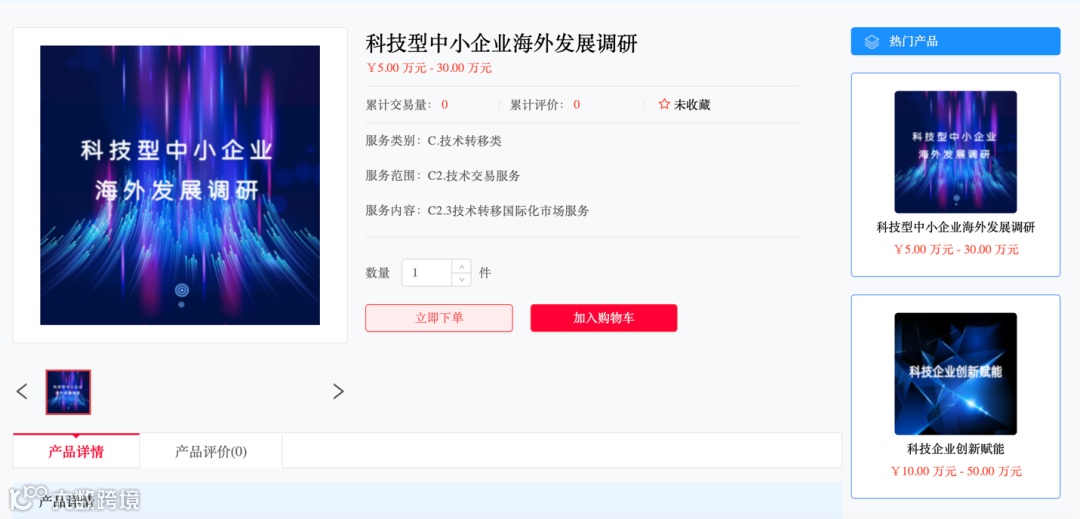 以“科技型中小企业海外发展调研”为例,点击“立即下单”即可完成申领;
