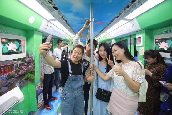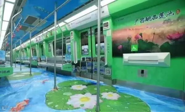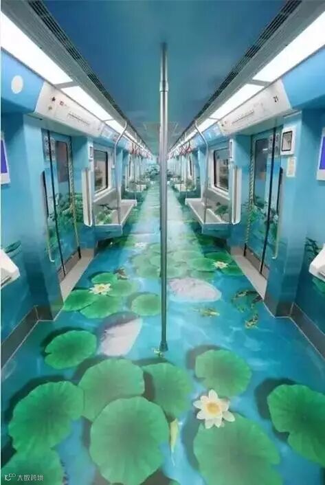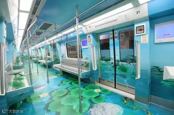 地铁1号线车厢内部全景展示荷塘图案,