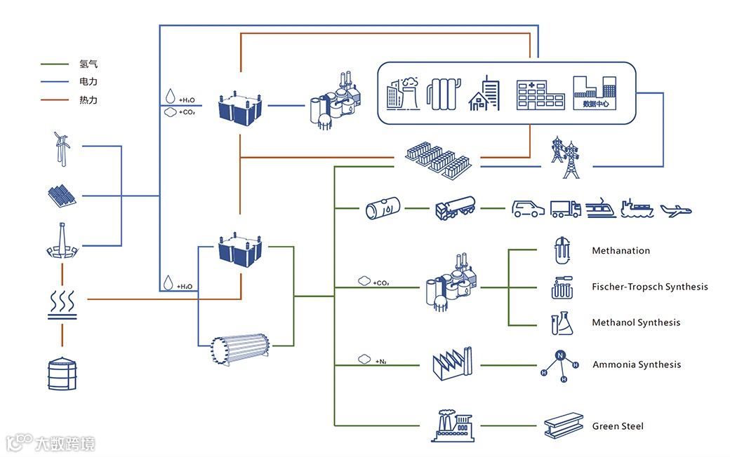 在西北等优势资源地区,我们投资建设部分绿氢项目,这些项目的电力均来自于周边的风电和光伏电站,中间没有任何的碳排放;通过不断的科技研发和创新,我们在努力降低我们产品和设备的能耗;在上游,我们与风电、光伏等新能源企业协同推进“风光氢储”一体化的项目建设模式;在下游,我们提出“电化学工厂”的概念,通过绿电和绿氢帮助下游企业深度脱碳,比如合成氨、冶金、交通等领域,通过我们独特的SOEC技术及碱性制氢技术,传统的化工企业,可以采用绿电来生产碳氢化合物,比如电制甲烷,甲醇等,理论上有碳有氢可造万物。未来,可能我们的衣服,鞋子,塑料袋等等,都将不再是由石油天然气或者煤炭为原料来生产,而是使用我们的技术,用绿电、绿氢以及通过CCS技术捕捉的CO2来生产的。