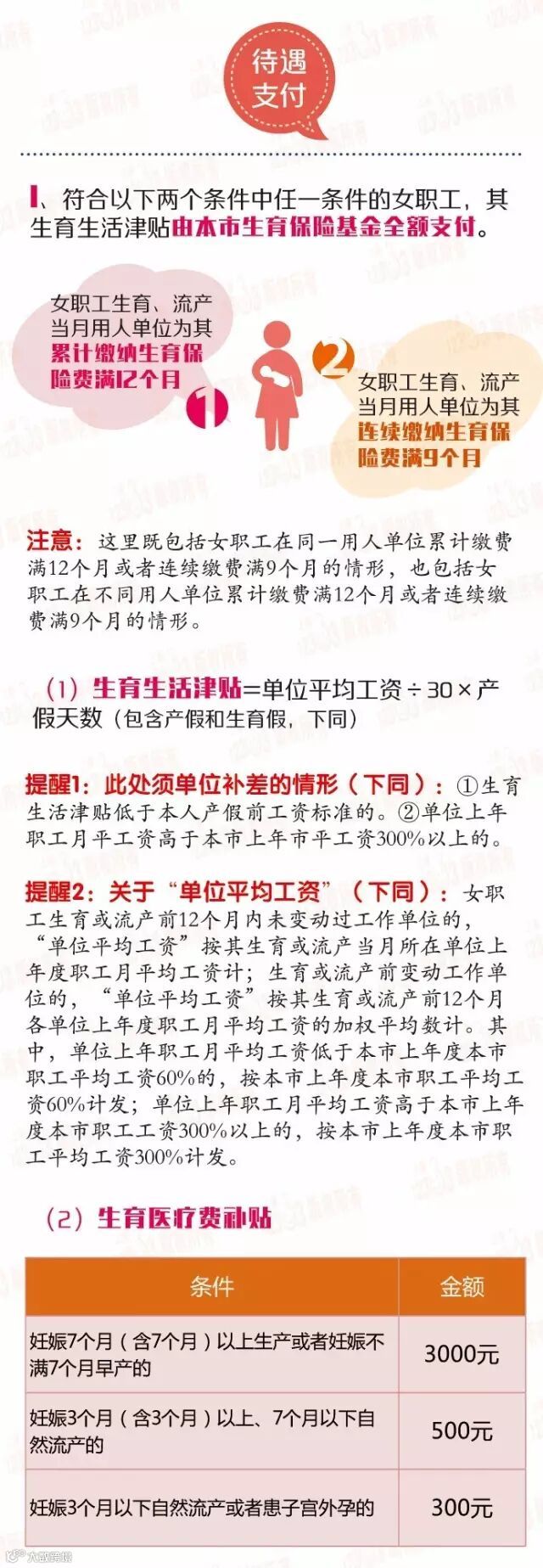 本市生育保险待遇申领新规7月起施行:女职工生育、流产当月单位为其累计缴纳生育保险费满12个月或连续缴纳满9个月的,生育生活津贴由生育保险基金全额支付;累计不满12个月且连续缴纳不满9个月的,津贴由生育保险基金按比例支付、剩余部分由单位先行支付。