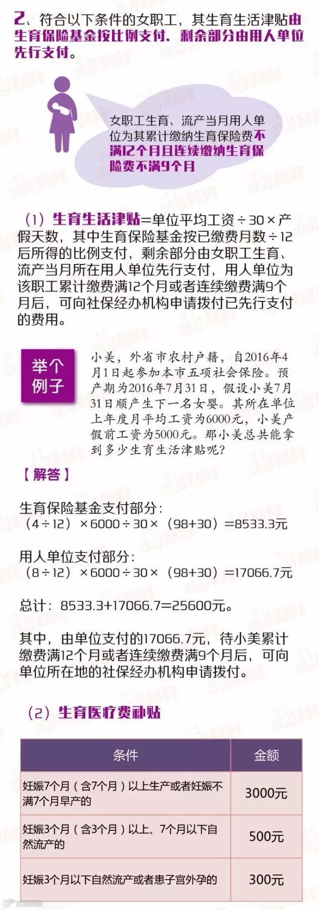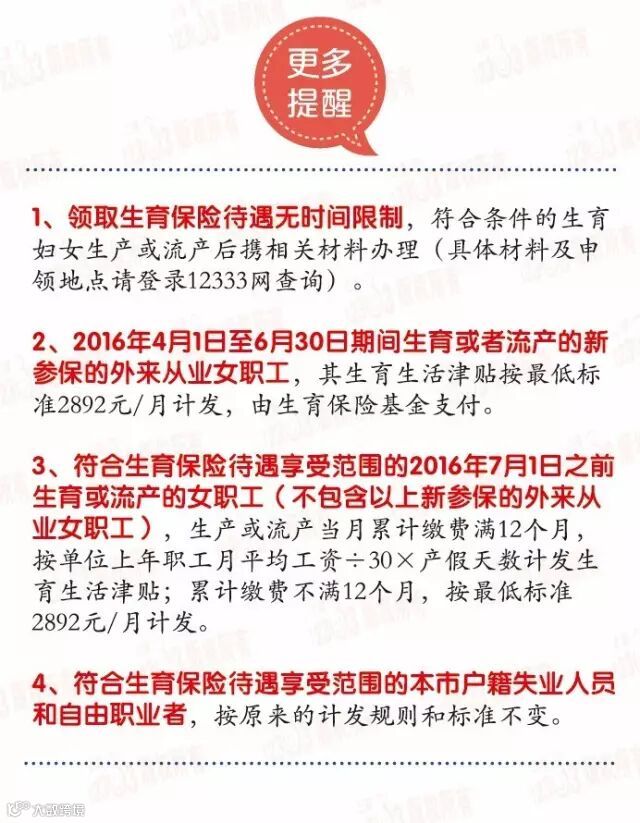 新规实施前,参加生育保险的女职工,缴费期限不满1年的,生育生活津贴只能按2892元的最低标准计发;新规定实施后,只要生育或者流产时正常参加本市生育保险,就可以按生育时所在用人单位上年度职工月平均工资计发生育生活津贴,总体待遇“不降反升”。