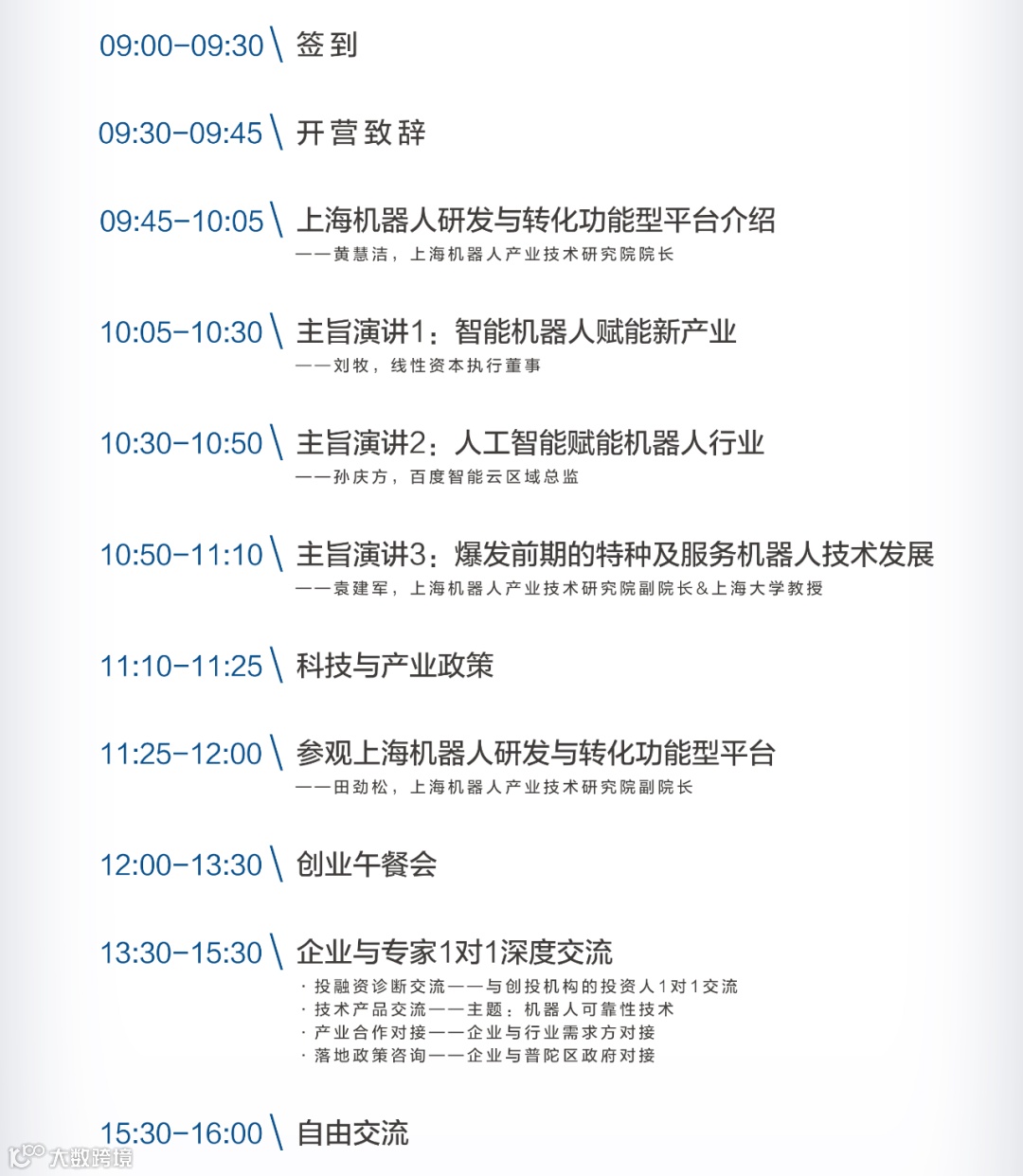 为进一步提高机器人产业创新能力,鼓励企业协同创新与技术融合,立足于“创•在上海”国际创新创业大赛,普陀区科学技术委员会、上海市科技创业中心、上海电器科学研究所(集团)有限公司联合举办“机器人创新对接营”。