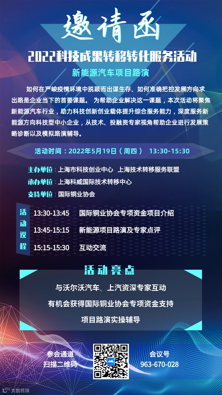 为助力科技创新创业载体提升综合服务能力,深度服务新能源方向科技型中小企业,在市科委关心指导下,上海技术转移服务联盟、上海市科技创业中心联合国际铜业协会,将在2022年5月19日举办“2022科技成果转移转化服务活动——新能源汽车项目路演”。