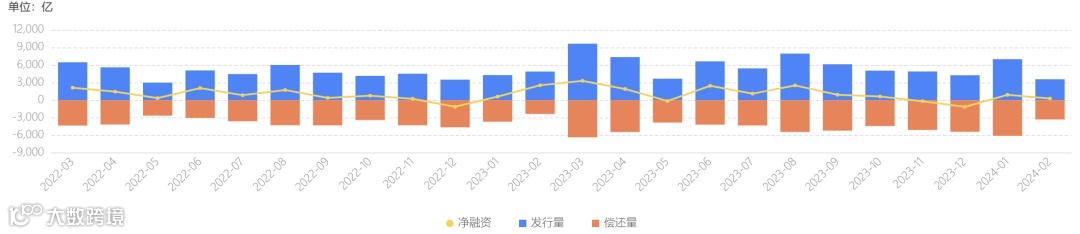 2024年2月份受春节假期影响,城投债发行与净融资规模缩量。当月共计发行3575.亿元,净融资904.41亿元。发行与偿还量较去年12月均有较大增长,并且从净偿还转变为净融资。