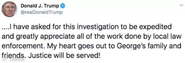 眼看形势失控,美国总统特朗普终于出来“灭火”,他于昨日发推特称,已要求联邦调查局(FBI)和司法部对弗洛伊德死亡事件进行深入调查。