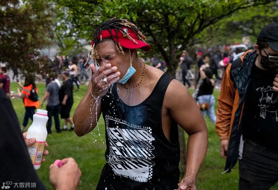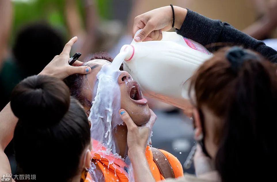 被瓦斯催泪弹灼伤的示威者,用牛奶灌洗全脸,缓解痛苦。