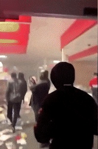 商场内的货架被洗劫一空,收银机被示威者用电动工具砸开,现金全被掠走,连店内的保险箱都难逃魔爪。