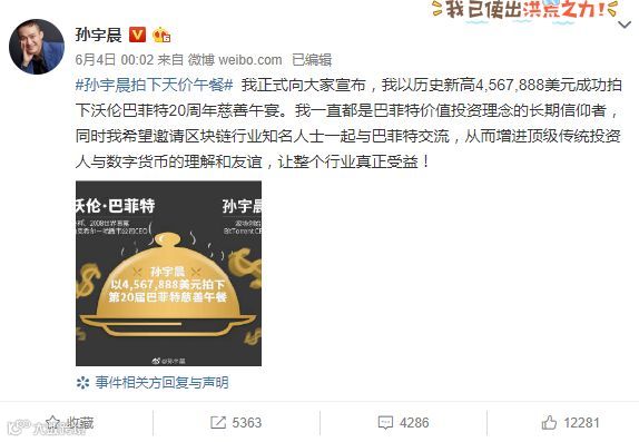 这位中国年轻人在微博上倒也直言不讳,想吃这顿午饭,就是要增进巴菲特等人对数字货币的理解和友谊。