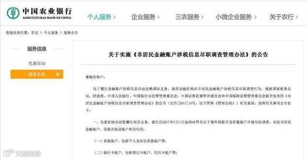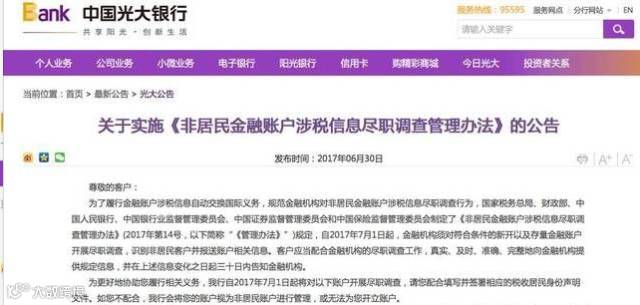 另外,包括工农中建、中信在内的十余家银行,已对公众刊出公告,要求存量非居民客户(即于今年7月1日前在银行开立过存款账户、银行卡、国债等的客户),从柜面或手机银行等签署税收居民身份声明文件。